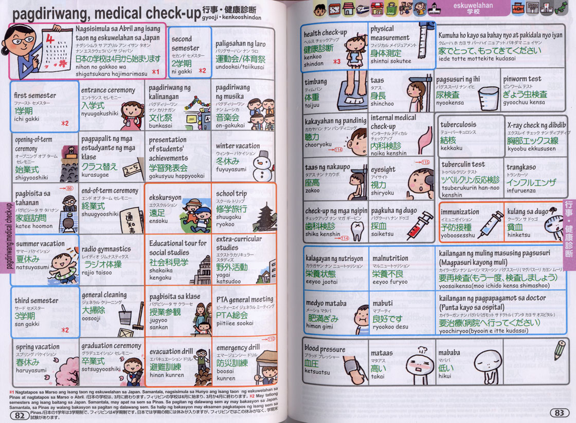 chapter1 Magandang hapon/こんにちは bilang,oras/数字・時間 bahay/家 bayan/街 tindahan/店 mga paninda/商品 usapan ng pamilya/家族の会話 anak/こども eskuwelahan/学校 trabaho/仕事 munisipyo/役所 trobol/トラブル nihonggo/日本語 chapter2 Para mas pasayahin ang araw araw na buhay / 日本の生活をより楽しくするために chapter3 Pilipino⇔Japanese talaan ng mga salita /フィリピン語→日本語 単語集 chapter4 Japanese⇔Pilipino talaan ng mga salita /日本語→フィリピン語 単語集 |